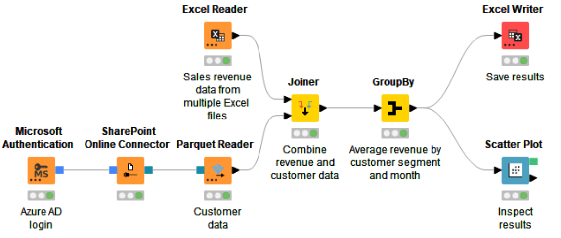 Collaborative: Data teams can create and share work easily: The data engineer can build a workflow which an ML engineer might not have been able to write themselves, but can understand and easily reuse: KNIME offers integrations to a multitude of tools and technologies